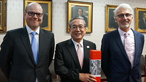 H.E. Mr. Jean-Francois Paroz, Ambassador Extraordinary and Plenipotentiary of Switzerland to Japan, visited Tokyo Tech on April 18 to attend a joint Tokyo Tech-Swiss workshop on science and technology-based activities to promote inclusive societies. While on campus, the ambassador met with Tokyo Tech President Yoshinao Mishima, Executive Vice President for Research Makoto Ando, and Professors Mitsuhiko Oi and Hiroyasu Horio of the Office of Research and Innovation.
