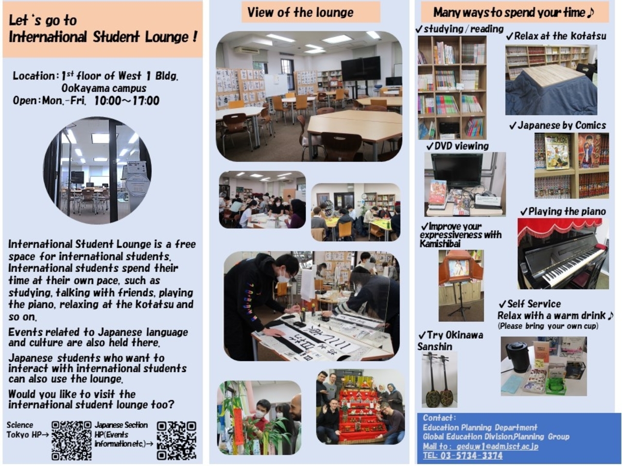 International Student Lounge is a free space for international students.International students spend their time at their own pace, such as studying, talking with friends, playing the piano, relaxing at the kotatsu and so on.