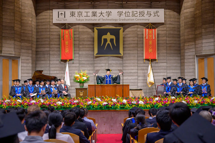 With feelings of gratitude, nostalgia, and excitement, I would like to conclude by drawing your attention to the Tokyo Tech Seal, the swallow by the window, one last time. This seal symbolizes the Institute as a hub of technical innovation from which the windows of the world open up to its members. You entered this window seeking knowledge, guidance, motivation, and excitement. Today, as you gaze out of this window and face the world, the Tokyo Tech swallow stands next to you, prepares its wings, and takes to the skies together. To celebrate and eternalize this final flight, my colleagues and I would like to take some commemorative photos with you, so please remain seated for a few minutes at the end of the ceremony.