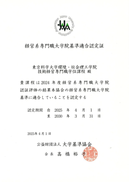 The School of Environment and Society’s Technology and Innovation Management / Innovation Science program at Science Tokyo, a professional graduate business school specializing in management of technology (MOT), underwent certified evaluation and accreditation of professional graduate business schools by the Japan University Accreditation Association (JUAA) in FY 2024. It was found to satisfy the standards specified by JUAA for evaluation and accreditation of professional graduate business schools, and received accreditation on March 14, 2025 (valid for the period from April 1, 2025 to March 31, 2030).