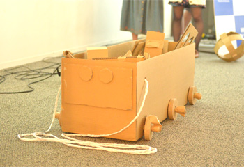 A train shaped like a toy chest ran through the audience. The group members picked toys out of the chest, played with them, and then put them back in the chest. People tend to think that they repeat meaningful activities every day.