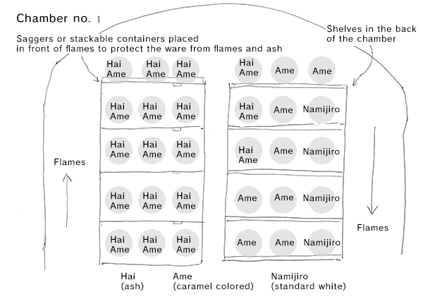 Traditional Mashiko glazes: Namijiro (standard white), Nukajiro (milky white), Hai (ash), Kuro (black), Nukaseiji (celadon), Ame (candy, transparent caramel color) and Kaki (color of persimmon seeds)