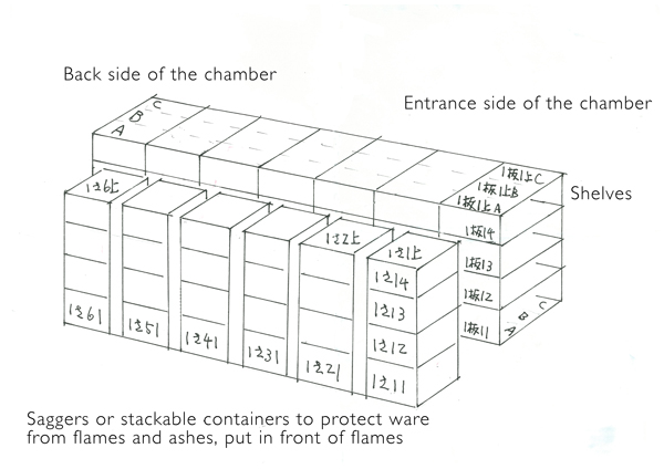 Firing continued throughout the night. For the firing during the night of March 27, students were divided into two groups to add firewood through the main stoke hole into the fire box of the kiln or through the smaller stoke holes located on both sides of each chamber. The timing and amount of firewood to be added were determined according to a pyrometer called a Seger cone located in the kiln. By controlling the flames and the amount of oxygen, chemical changes and effects in the clay and glazes were induced.