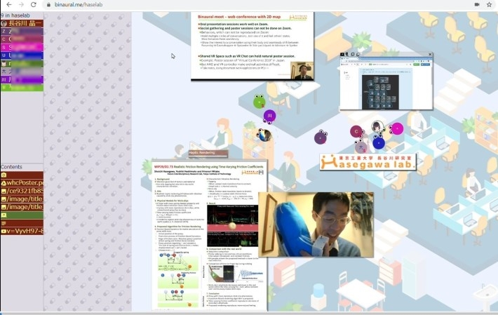 Prior to COVID-19, even when telecommunicating seemed convenient, we spent the time and money to go to meet people directly by plane or train. The main reason for this was that telecommunication performance was low, and we did not have a VR space comparable to real space. Therefore, I have focused on pursuing reality in VR space. However, due to COVID-19, we were suddenly forced to use telecommunications, and with urgency. Presentations at academic conferences are usually given by one speaker, with the rest of the participants being audience members. As such, there is no problem holding presentations online. The challenge, however, is how poster sessions and social gatherings normally held at venues can be held online. For example, in the case of a poster session, only interested listeners will approach the presenter to ask questions. Conventional telecommunications do not have such a feature. Therefore, we worked hard to develop "Binaural Meet" (Figure 1) for holding poster sessions online. A key aspect of Binaural Meet is that it does not require any special devices, such as an HMD, so the software can be easily used by anyone.