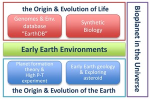 The research at ELSI has the grand aims of exploring "the origin of the Earth" and "the origin of life", both of which are fundamental questions to humankind. They are inseparable topics, because nature of the first life should have been strongly controlled by surrounding environments. Similarly we will also examine the evolution of life in the context of the evolution of the Earth.