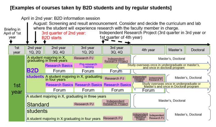 B2D students may take B2D Research Basics (B2D courses) that provide introductory research experience at laboratories from the fall semester of their second year of the undergraduate program. Consequently, they can investigate their intended field of research. Once the field of research is determined, students may take B2D Pre-research Training (B2D courses) from the spring semester of their third year of the undergraduate program. B2D Pre-research Training allows Independent Research Projects at the intended laboratory.