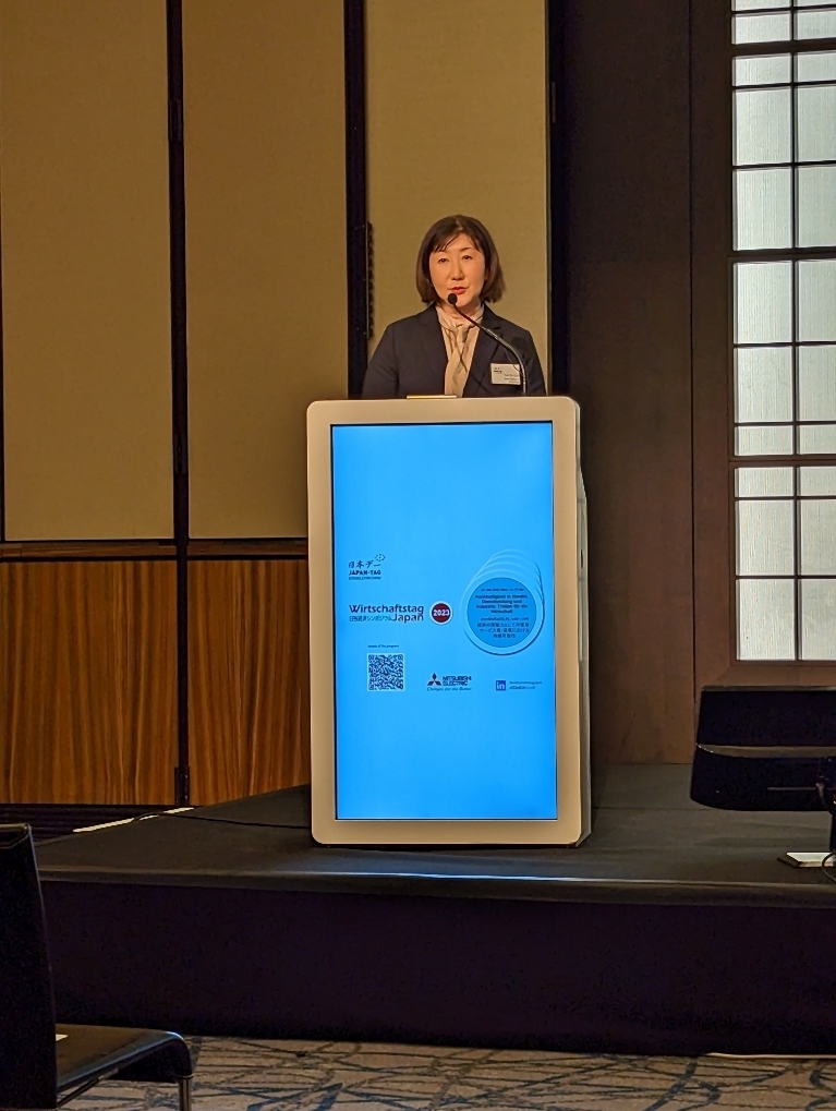 5月22日(月)にドイツのデュッセルドルフ市で開催された日独経済シンポジウムにおいて、本学の後藤美香教授が基調講演をしました。 日独経済シンポジウムはユニークな文化と出会いの祭典としてデュッセルドルフ市で行われる「日本デー」の一環として2002年から毎年開催されています。 今回のテーマは「経済の原動力としての貿易・サービス業・産業における持続可能性」です。科学技術ではないテーマで、本学が依頼を受けたということは非常に喜ばしいことで、本学のNRW州における知名度の向上にも大いに期待ができると考えます。 後藤教授からは、日独の経済の比較、研究力の比較等分かりやすく説明した上で、本学におけるイノベーション、スタートアップ等の紹介を行いました。大変分かりやすい説明で、参加者からの評価も高かったようです。 参加者は300名を超え、ネットワーキングでは川原総領事、NRW州経済大臣をはじめ、日系企業の皆様と貴重な情報交換の機会を持つことができました。 また、日系企業からアーヘン工科大学に研究員を派遣しているケースや、現地の研究機能を整備しているようなケースもあり、ANNEXを通した産学の協力体制も期待できるように思いました。