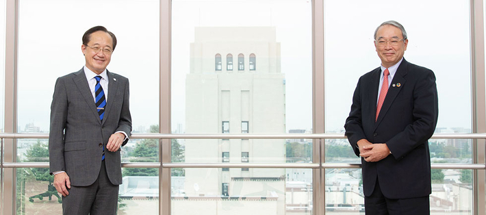 倉田英之 AGC株式会社 取締役兼常務執行役員 CTO・技術本部長と渡辺治 理事・副学長(研究担当)による対談