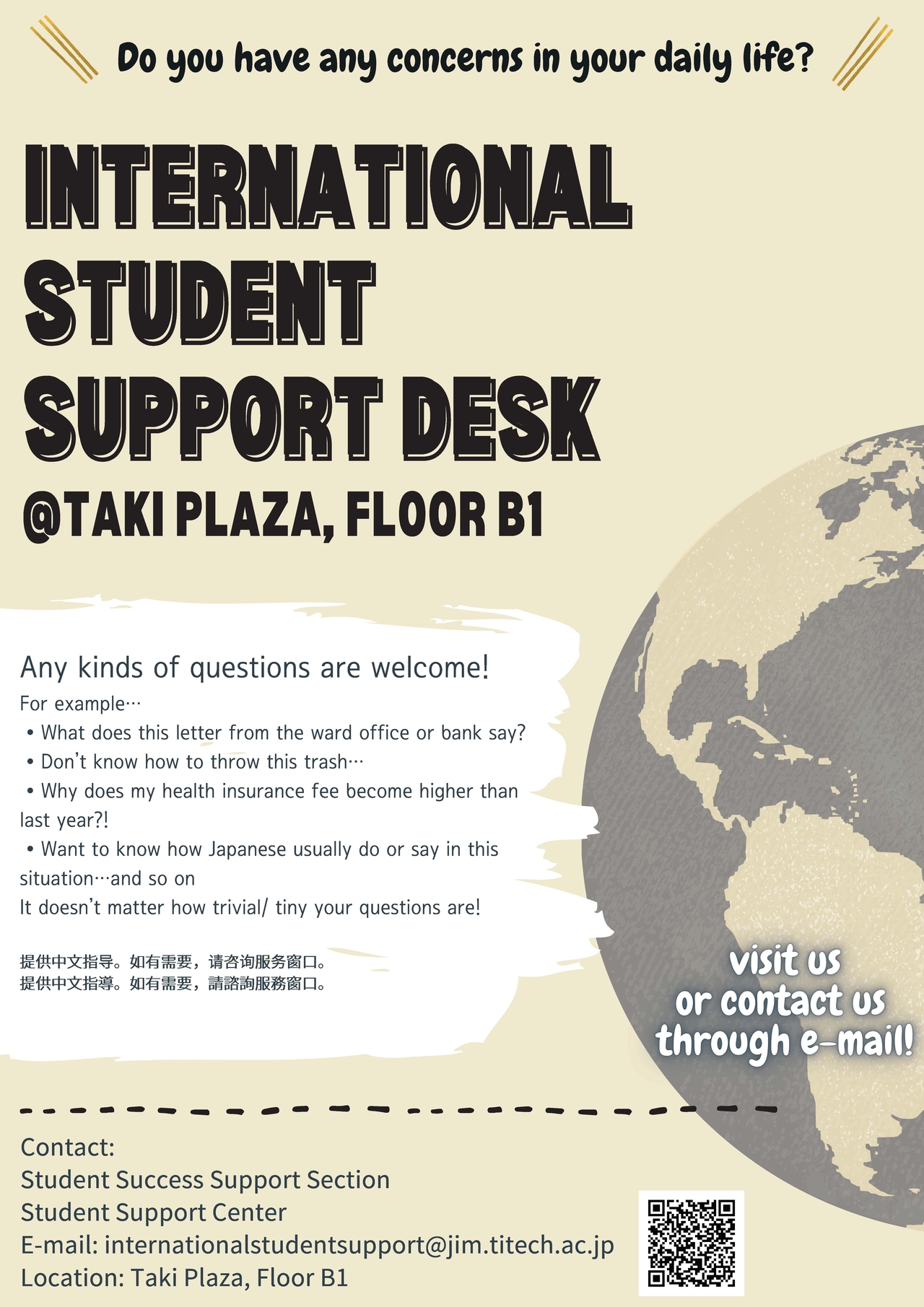 留学生の日常生活に関わる質問・相談をTaki Plaza B1階カウンターにて受けつけています。