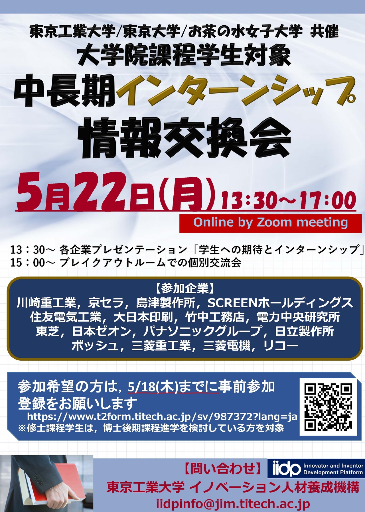 今年で8回目となる「大学院課程学生向け 中長期インターンシップ情報交換会」を,5/22(月)にオンライン(Zoom)で開催します。