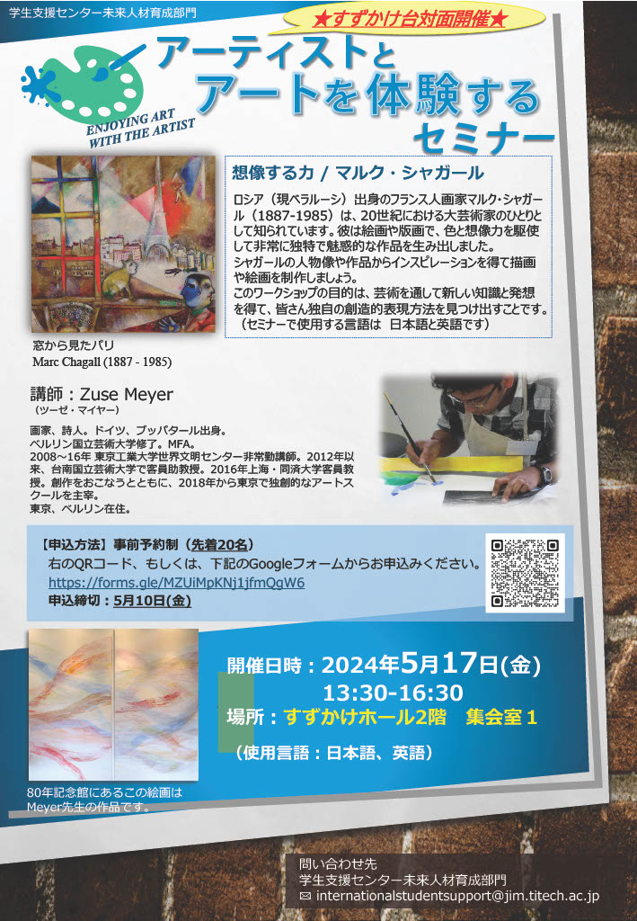 学生支援センター未来人材育成部門では、理工系の学生が芸術からインスピレーションを得て、自身の創造力を豊かにするため、毎年2回、「アーティストとアートを体験するセミナー」を開いています。