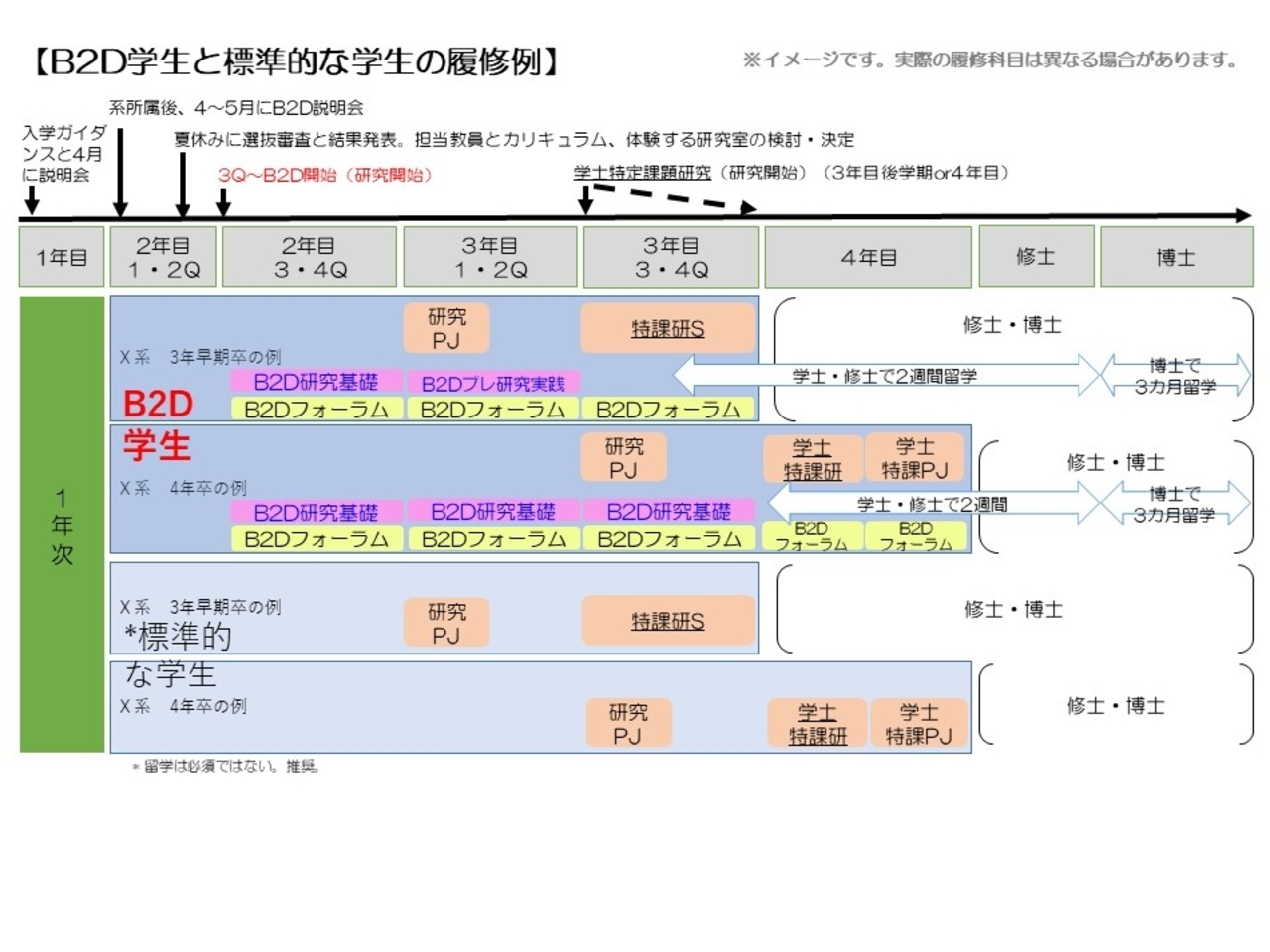 学院の標準学修課程では学士課程4年次の「学士特定課題研究」(以下「学士特課研」)で研究を開始* しますが、B2Dスキームの履修学生(B2D学生)は、学士課程2年次から研究を開始できます。