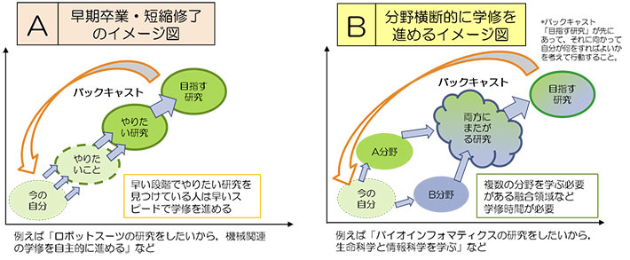 B2Dスキームでは、自身の目指す研究からバックキャストしてB2Dでの学修内容を決め、研究分野を選ぶことを想定しています。